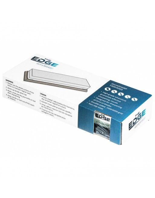 THE EDGE stone SHARP 1000/6000 je oboustranný korundový vodní kámen, který při správné zručnosti umožňuje dokonalé nabroušení nože. Kámen má dvě gradace, tedy jemnou 1000 (tmavě šedá) pro rychlé ostření a vyhlazení a ultra jemnou 6000 (bílá) pro správné ostření a rychlé ostření lehce tupých nástrojů. Pro leštění kuchyňských nožů, břitev a nástrojů, kterým chceme dodat dokonalou ostrost, se výborně hodí stupně 1000 a 6000. Velký povrch (180 × 60 mm) umožňuje pohodlně brousit na kameni velké nástroje, např. sekery, mačety.