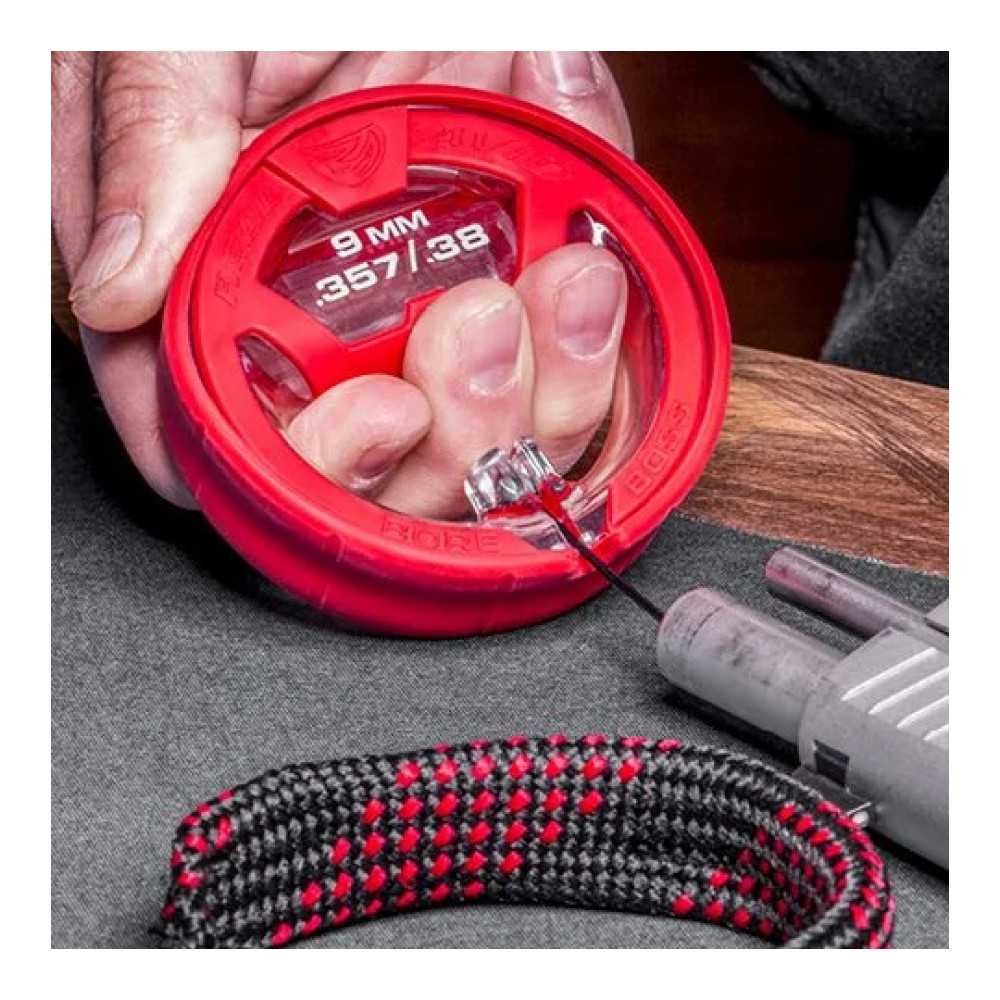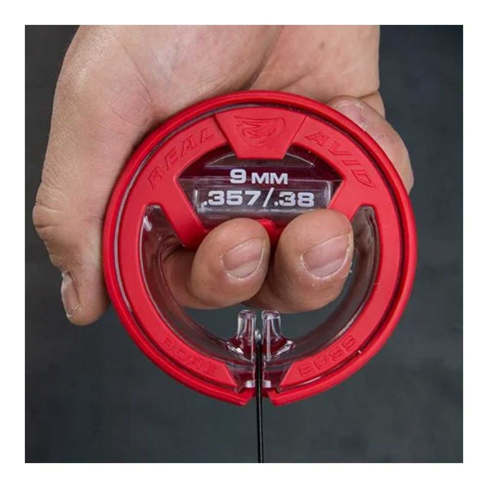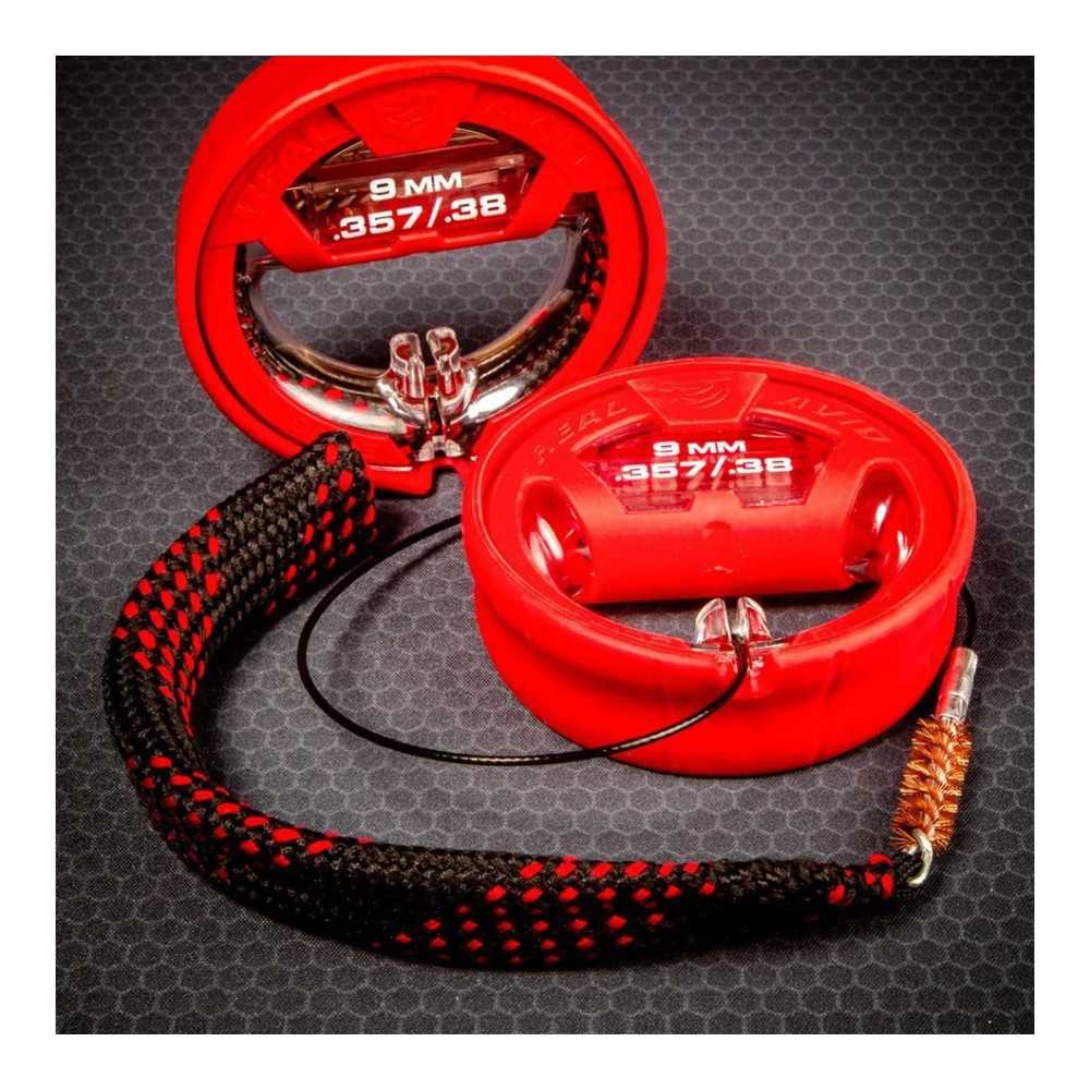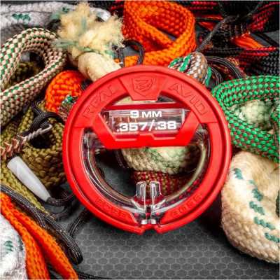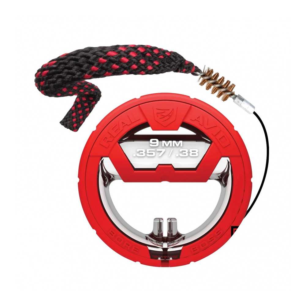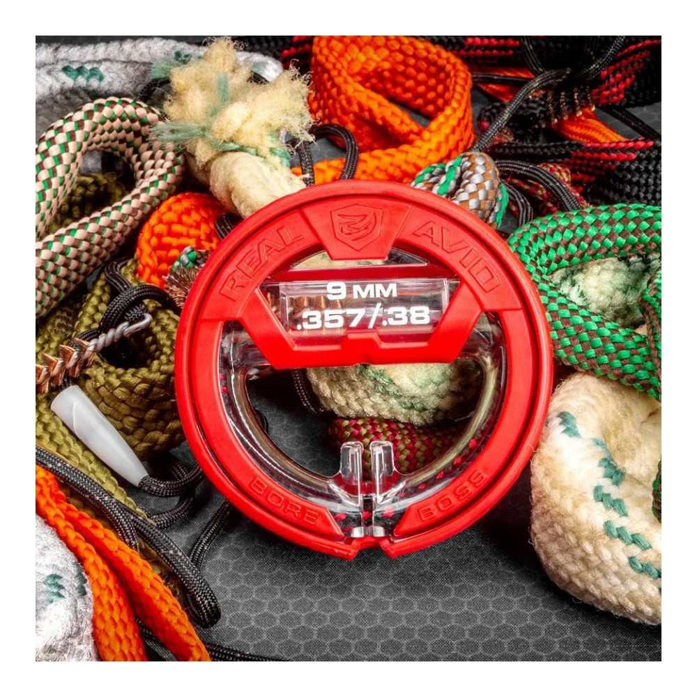 Čisticí šňůra Real Avid Bore Boss je nesmírně rychlý a pohodlný nástroj pro odstranění zbytků prachu a olova z hlavně zbraně. Tento model ukazuje nejvyšší úroveň ergonomie možnou pro tento druh nástroje – dvojité využití obalu zajišťuje nejen čisté a organizované skladování, ale také pohodlný úchop během čištění. Verze je určena pro zbraně v kalibrech .38, .357 a 9 mm.