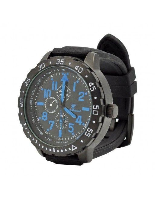 Kvalitní hodinky značky Smith & Wesson vybavené přesným japonským strojkem a gumovým řemínek. Průměr ciferníku je cca 50 mm (včetně korunky 53 mm). Voděodolnost hodinek 50 M.