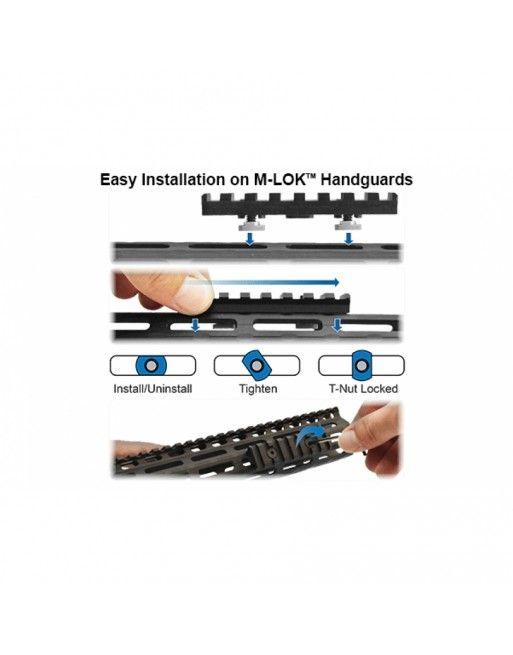 Montáž kolejnice je velmi jednoduchá a zvládnete ji sami během pár sekund. Sada obsahuje ocelový šroub, matici M-LOK a imbusový klíč.