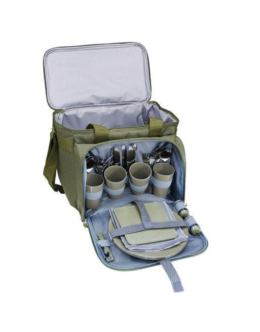 V srdci této piknikové tašky je komplet nádobí a příbory pro čtyři osoby. Set obsahuje 4x prostírání, 4x plastový talíř, 4x kelímek, 4x kompletní příbor, mazací a řezací nůž, plastové prkénko a dvě kořenky. Toto všechno vám umožní vychutnat si svůj piknik bez jakýchkoli komplikací.