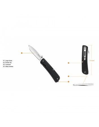 Za bezpečnost použití je zodpovědná jistá pojistka čepele liner-lock. Díky jednostrannému klipu lze nůž připevnit jak na opasek, tak na okraj kapsy. Kapesní nůž je na konci rukojeti opatřen rozbíječem skla, díky kterému jej lze použít jako záchranný nástroj. Do rukojeti nože výrobce umístil i pinzetu.