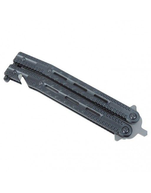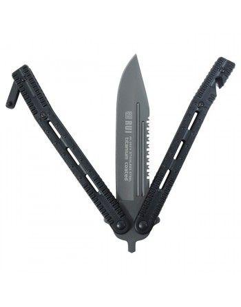 Kovový zavírací nůž, tzv. motýlek s šedým titanovým povrchem. Otevřete ho (nebo zavřete) jednoduše překlopením dvoudílné rukojeti a zajistíte pojistkou na konci rukojeti. V rukojeti jsou podlouhlé otvory a drážky proti vyklouznutí nože z ruky. V zavřeném stavu je na konci rukojeti hrot na rozbíjení skla, z druhé strany řezač popruhů. Součástí balení je nylonové pouzdro.