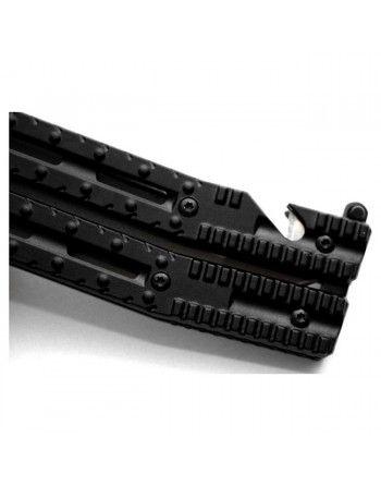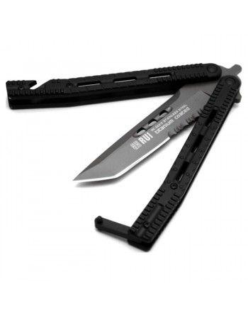 Kovový zavírací nůž, tzv. motýlek s tanto čepelí a šedým titanovým povrchem. Otevřete ho (nebo zavřete) jednoduše překlopením dvoudílné rukojeti a zajistíte pojistkou na konci rukojeti. V rukojeti jsou podlouhlé otvory a drážky proti vyklouznutí nože z ruky. V zavřeném stavu je na konci rukojeti hrot na rozbíjení skla, z druhé strany řezač popruhů. Součástí balení je nylonové pouzdro.