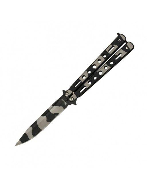 Joker JKR707 je levný trikový motýlkový nůž s pevnou kovovou konstrukcí a maskáčovou úpravou.