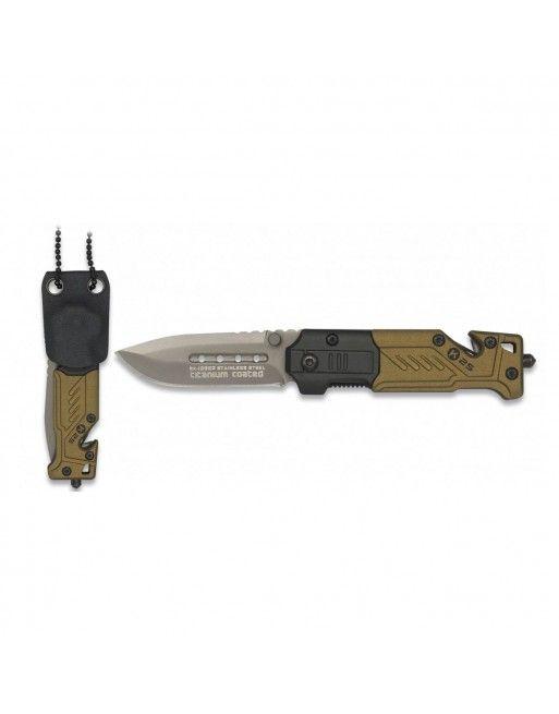 Minimalistický zavírací nůž od španělské značky K25. Čepel je vyrobená z nerezové oceli s titanovým povlakem a v otevřeném stavu je fixována pojistkou LinerLock. Rukojeť je hliníková, a na jejím konci je umístěn řezač pásů a kovový hrot na prorážení skla. K noži je dodáváno kydexové pouzdro pro zavěšení na krk.