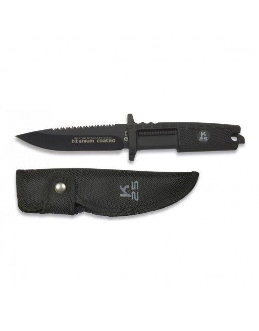 Kvalitní taktický nůž RUI 31910 v černém provedení, s čepelí z nerezové oceli 440 a titanovým povrchem pro lepší vlastnosti jako jsou: ochrana proti korozi, ochrana proti nežádoucím odleskům atd. Nůž má hladké ostří a na hřbetě je krátká pilka. Pogumovaná rukojeť má kovovou záštitu proti sklouznutí prstů na otří. Součástí balení je nylonové pouzdro.