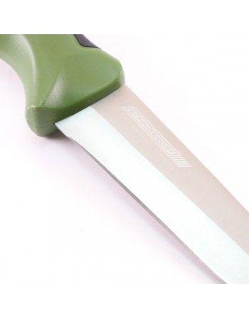 Pevná čepel s hladkým ostřím. Protiskluzové gumové plochy . Polymerové pouzdro.
