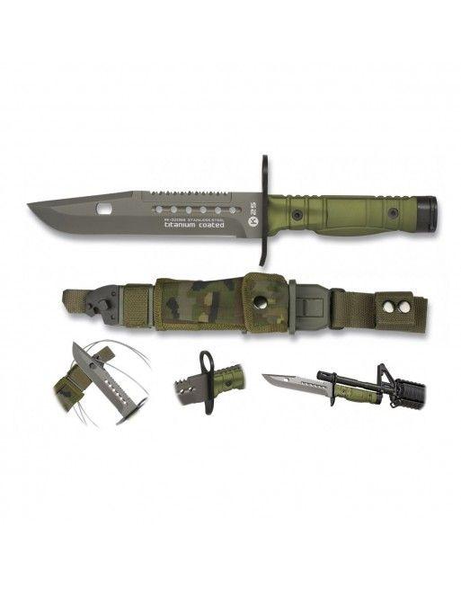 Taktický nůž s pevnou čepelí z nerezové oceli s titanovým povlakem pro lepší vlastnosti. Rukojeť je vyrobena z hliníků a je potažena kvalitní gumou s protiskluzovou úpravou. Nůž je dodáván s pouzdrem v zelené barvě