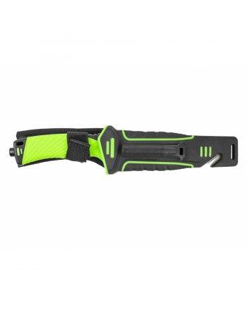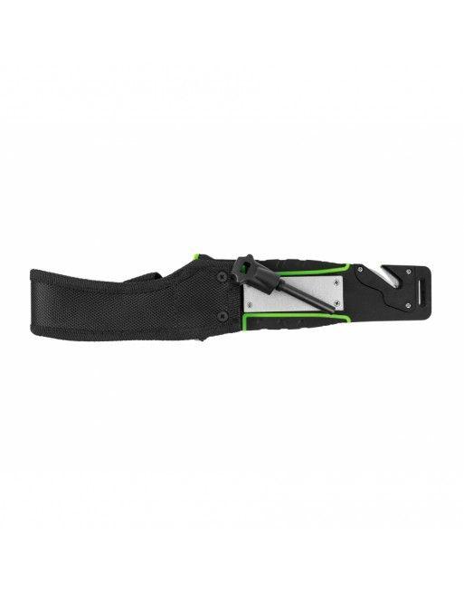 Zde však není důležitý pouze nůž, pochva Ganzo G8012 je plná překvapení! Na jeho vnější straně se nachází hořčíkové křesadlo, se kterým snadno rozděláte oheň. Jdeme dále po okraji pochvy, najdeme řezák (rozebraný!) na vlasce, opasky atd. a připravené očko pro vlasec, což nám dává mnoho možností pro uchycení nože. Na vnitřní straně najdeme brousek, který nám umožňuje rychle a efektivně brousit našeho „ručního Ramba“ v terénu. Pouzdro je vyrobeno z ABS plastu a je zakončeno materiálem Cordura s očkem pro upevnění na opasek.