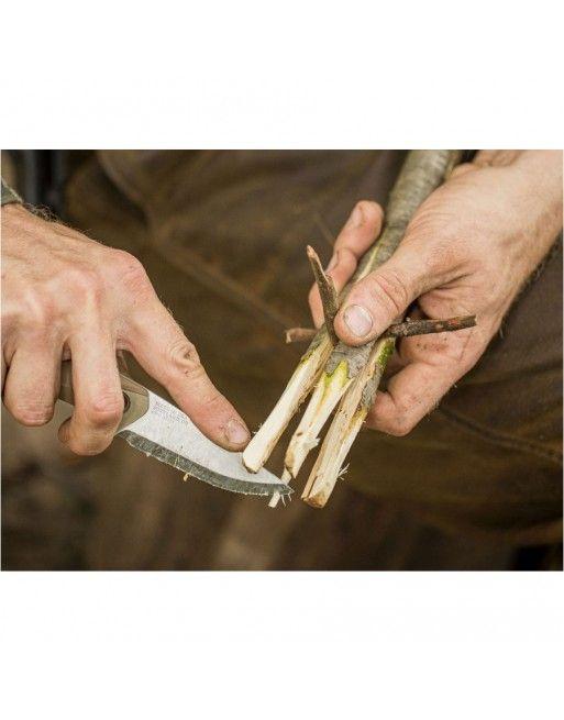 Čepel s optimální pracovní délkou (82 mm) má použitelný profil drop-point a tradiční skandinávský řez s vynikajícími řeznými vlastnostmi. Plochý hřbet čepele s úhlem 90° se skvěle hodí pro spolupráci s křesadlem a usnadňuje tak zakládání ohně.
