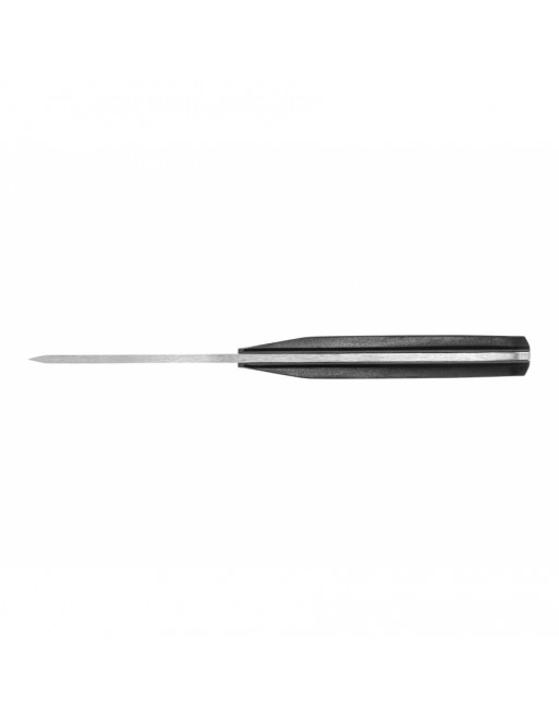 Pevná čepel s hladkým ostřím. Protiskluzové gumové plochy . Polymerové pouzdro.