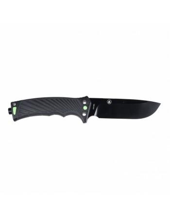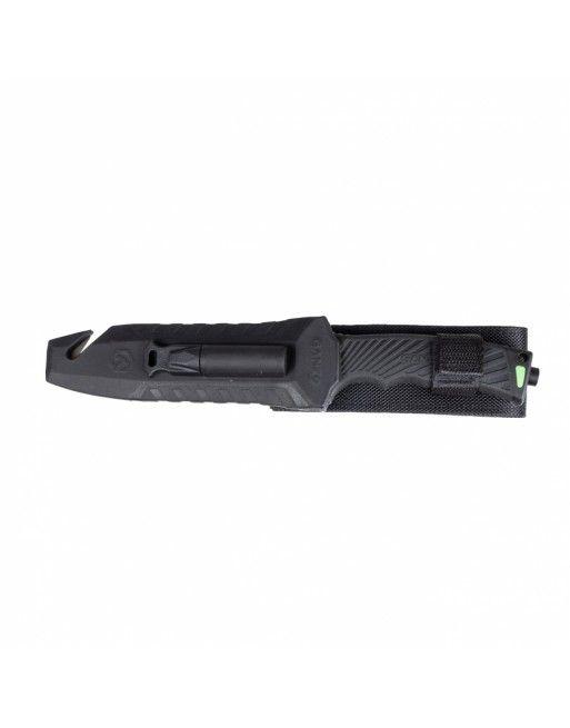 Ergonomická rukojeť z odolného polymeru má protiskluzovou strukturu a výřezy pro prsty, které zajišťují pevný a bezpečný úchop. Zvýrazněné prvky s vyšší viditelností pomáhají nůž snadno najít i v přírodním prostředí. Otvor v rukojeti umožňuje připevnění paracordu nebo bezpečnostní šňůry.