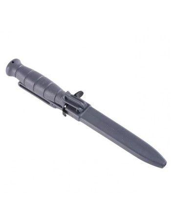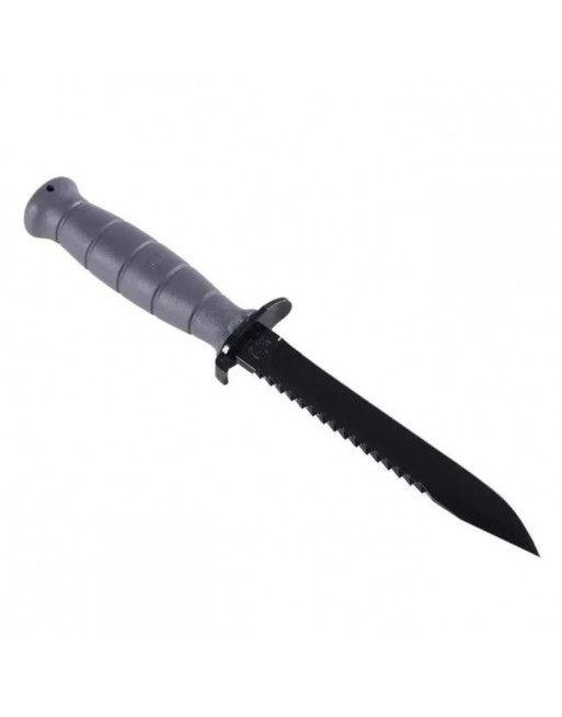 Pevná čepel s hladkým ostřím. Protiskluzové gumové plochy . Polymerové pouzdro.