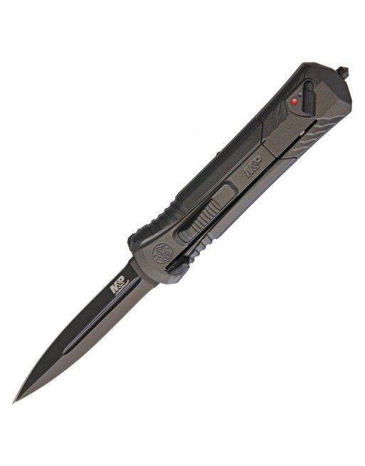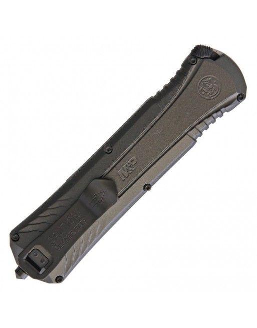 Nůž s čepelí ukrytou v rukojeti. Čepel nože je na jedné straně s hladkým ostřím, s černěným povrchem. Na čepeli označení řady M&P a značky Smith & Wesson.