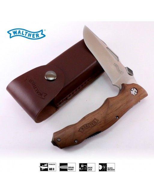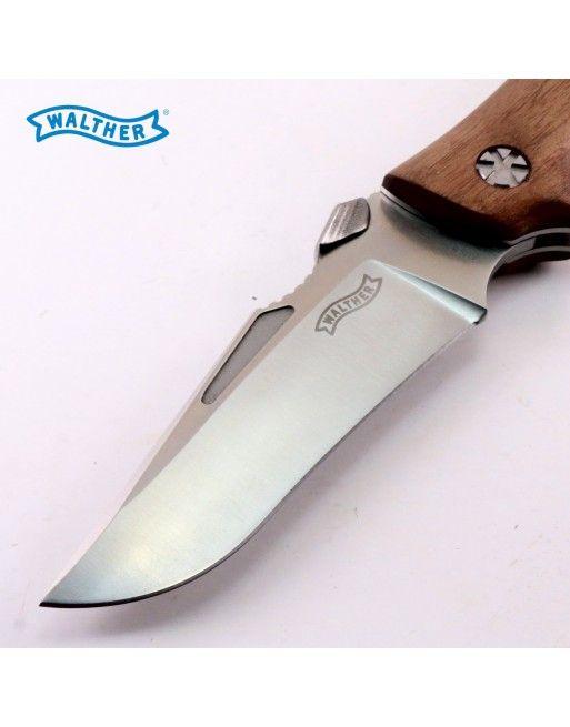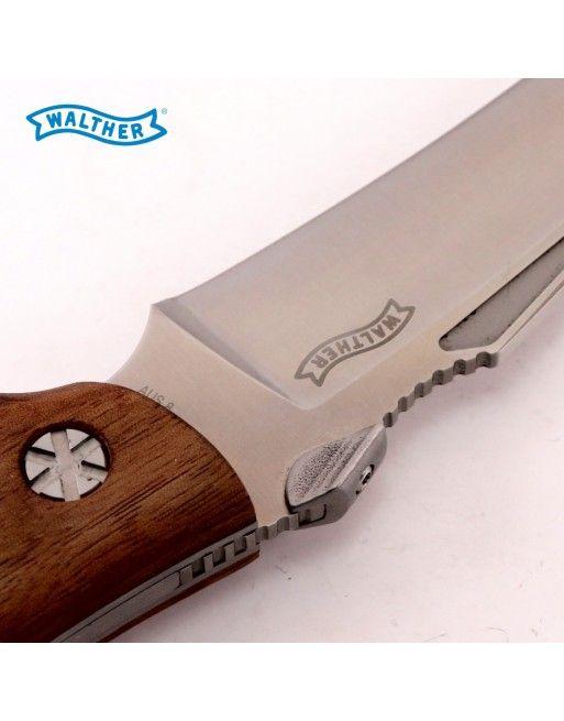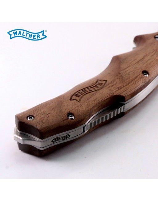 Kovová konstrukce nože, ergonomicky tvarovaná rukojeť je z ořechového dřeva a doplněna je logem Walther.