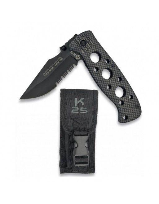Zavírací nůž 19220 od španělské firmy K25 v netradičním provedení. Elegantní čepel z nerezové oceli 440 s titanovým povrchem pro lepší vlastnosti. Rukojeť potažená gumou (Rubber Coated) s hrotem na rozbití skla na konci. Otvírání nože pomocí kolíčku v čepeli. Pojistka nože je Liner Lock. Nůž je dodáván s pevným nylonovým pouzdrem.