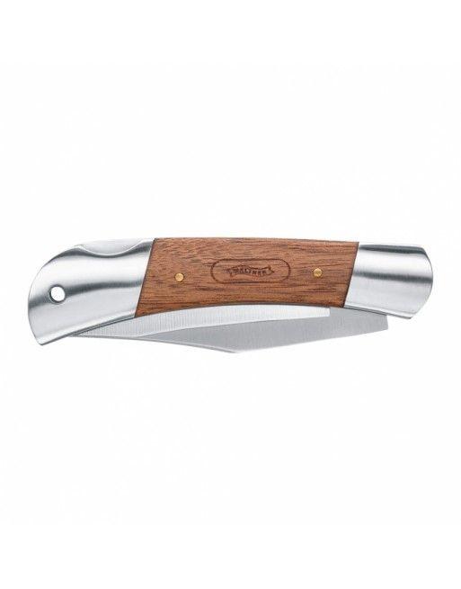 Klasický zavírací nůž s čepelí tvaru clip point, vhodný jako nůž do přírody, na turistiku nebo jako menší zavírací lovecký nůž. Čepel z nerezové oceli 440C s dutým výbrusem má délku 8,6 cm. Díky jejímu tvaru má velmi dobré řezné vlastnosti, které oceníte například při krájení potravin. Rukojeť z nerezové oceli doplněna o střenky z elegantního ořechového dřeva. Nůž je vybaven pojistkou back lock, která je pevná a spolehlivá. Nůž se otevírá pomocí drážky na nehet.