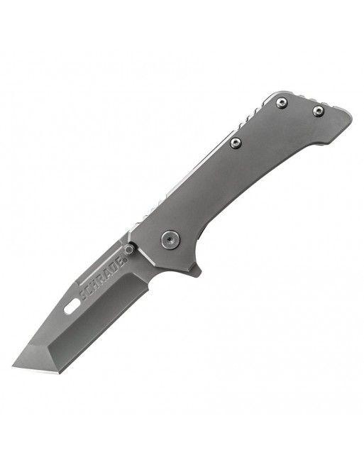 Robustní zavírací nůž se špičkou typu TANTO od značky SCHRADE. Čepel je vyrobená z nerezové oceli, disponuje hladkým výbrusem, oboustranným kolíčkem pro snadné otevírání a je pokryta vrstvou titanu, který zlepšuje odolnost vůči korozi.