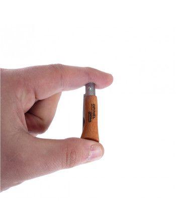 Nůž má malou čepel o délce 35 mm vyrobenou z tvrdé uhlíkové oceli XC90. Díky vysokému obsahu uhlíku (až 0,90 %) je čepel z oceli XC90 odolná proti mechanickému poškození, zůstává dlouho ostrá a řeže mnohem agresivněji než nerezová ocel. Mějte však na paměti, že uhlíková ocel je náchylná ke korozi, a proto vyžaduje pravidelnou a správnou údržbu. Po každém použití by měla být čepel důkladně vyčištěna, vysušena a chráněna lněným / kaméliovým olejem nebo syntetickým mazivem na nože. Stejně jako u ostatních modelů Opinel je k rozvinutí čepele použit výřez na hřebík.
