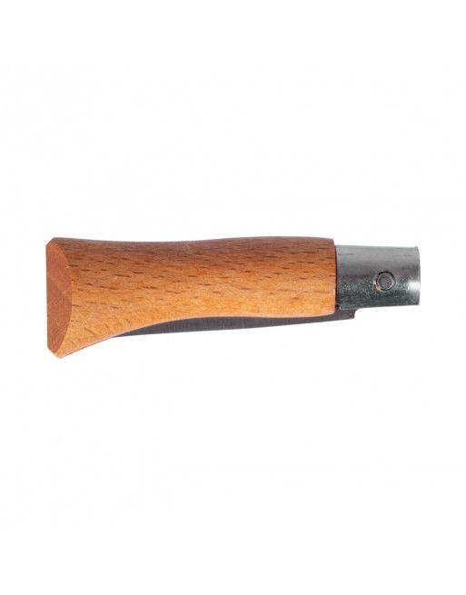 Dřevěná rukojeť Rukojeť je vyrobena z francouzského bukového dřeva s lakovaným povrchem, který chrání před nečistotami a vlhkostí. Rukojeť má tradiční oválný profil, který se na konci rozšiřuje, díky čemuž je nůž pohodlný a bezpečný v ruce. Na rozdíl od větších modelů nemá nůž Opinel 2 zámek Virobloc.