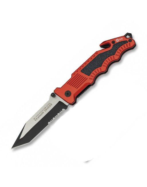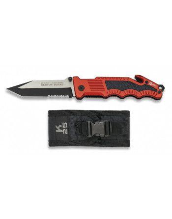 Rukojeť nože je vyrobena z červeno-černého hliníku a měří 11,2 cm, což zajišťuje pohodlný a pevný úchop. Váha nože 125 gramů ho činí dostatečně lehkým pro snadné nošení, ale přitom dostatečně těžkým na to, aby vám poskytl dobrou kontrolu při řezání. K25 záchranářský nůž je navíc vybaven klipem pro pohodlné nošení na opasku.