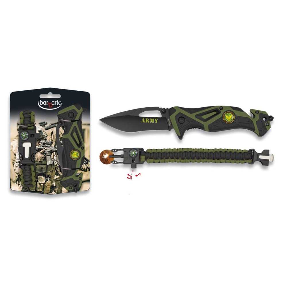 Praktický set tvořený stylovým záchranářským nožem v army stylu a praktickým paracordovým náramkem.