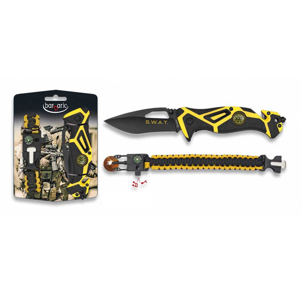 Čepel nože s hladkým ostřím je vyrobená z nerezové oceli 3Cr13Mov. Je opatřená nápisem "SWAT" a oboustranným kolíčkem pro snadné otevírání jednou rukou. V otevřeném stavu je čepel nože jištěna pomocí spolehlivé pojistky typu LinerLock. Rukojeť je vyrobená z ABS plastu pokrytého protiskluzovou gumou. Na jejím konci naleznete velmi ostrý řezač pásů a rozbíječ skla. Paracordový náramek je vyrobený z pevného nylonu a disponuje kompasem, píšťalkou a nouzovým křesadlem.