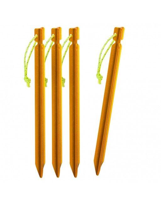 Sada čtyř lehkých hliníkových kolíku v oranžové barvě od známé značky HELIKON-TEX. Kolíky mají šípovitý tvar, díky kterému jsou odolnější a lépe pronikají do země. Díky dodávaným šňůrkám se kolíky snadno vytahují ze země.