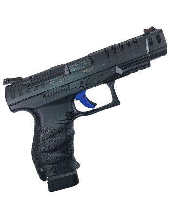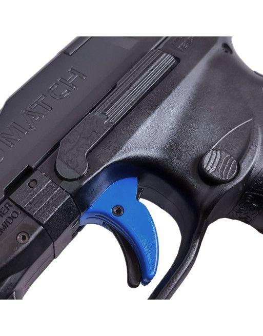 Spoušť této pistole, vyrobená firmou Apex, je výrazně modré barvy a má zkrácený chod a snížený odpor, což usnadňuje přesnou střelbu.