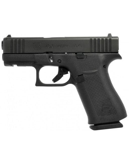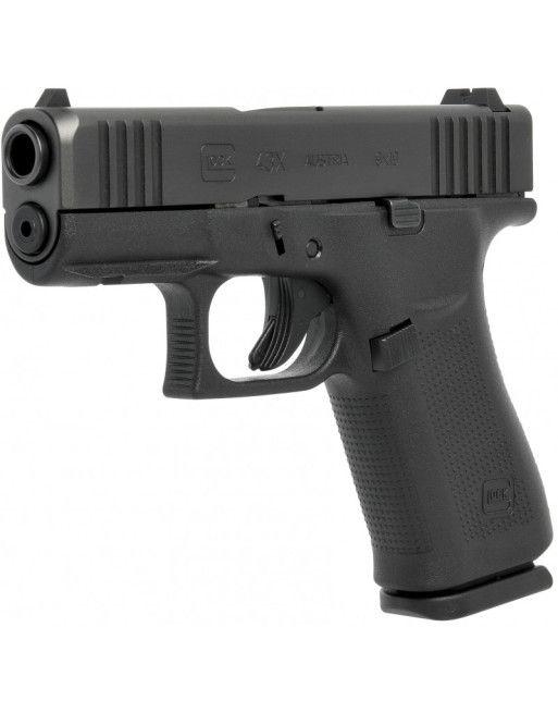 Nové provedení Glocku 43X s railem na rámu zbraně. Jedná se o nejnovější model ve velikosti subcompact s jednořadým zásobníkem v ráži 9x19 řady slimline vhodná pro skryté nošení. Standardně dodávána v sadě se dvěma zásobníky na 10 nábojů.