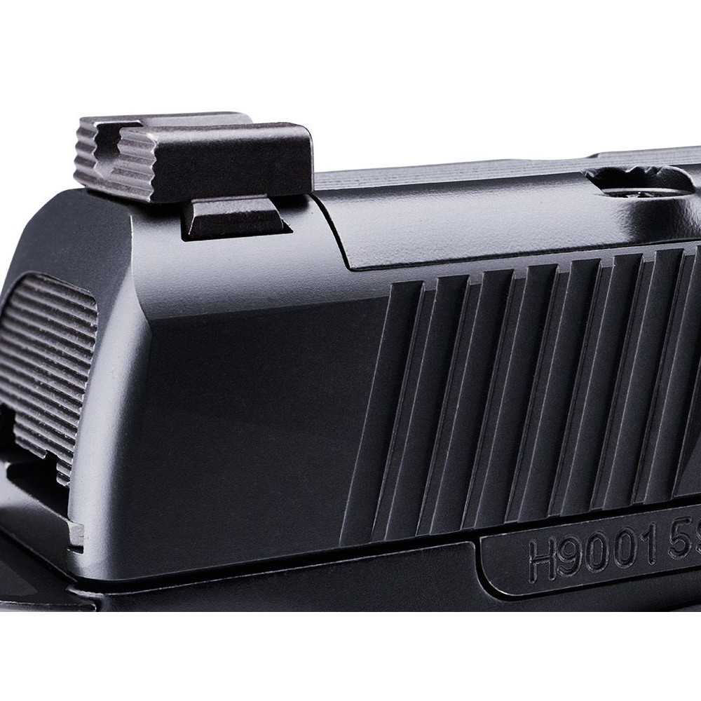 Mířidla? Na předku světlovod, vzadu blackout U-notch – ideální kontrast na rychlé zacílení. Závěr je připravený na montáž optiky, a pod hlavní najdeš STANAG 4694 rail, takže světlo, laser nebo obojí – fantazii se meze nekladou.