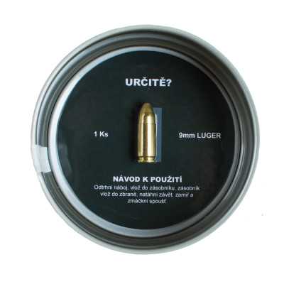 Otevři konzervu a najdi pečlivě uložený poslední náboj 9mm Luger. Ideální pro ty momenty, kdy potřebuješ mít po ruce "záchranný plán". Tento vtipný dárek je perfektní pro sběratele, nadšence do střelby, nebo jako netradiční překvapení pro kamarády.