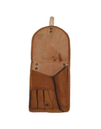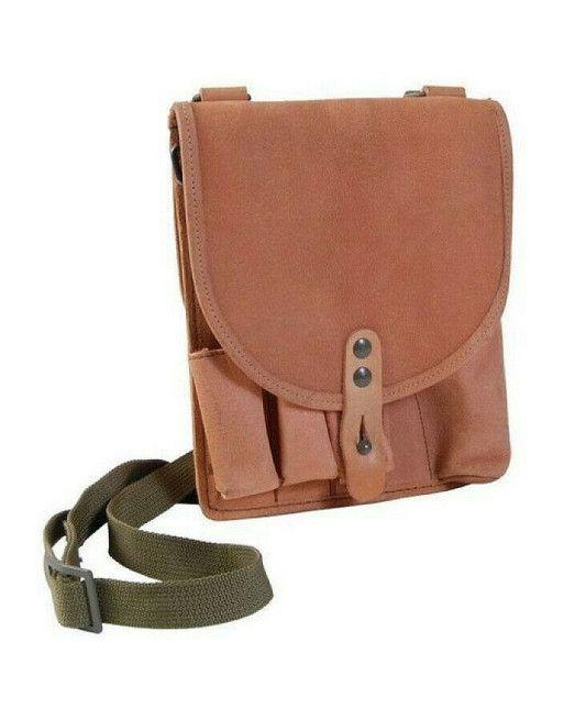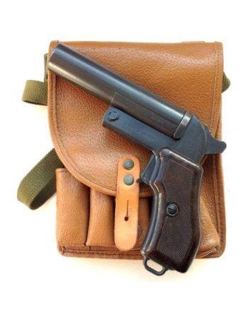 Originální vojenské kožené pouzdro na signální pistoli vz.44. Prostor ve předu na pistoli a tři patrony, zazadu zásobník na 5 patron. Oba prostory se zavírají přiklopením víka a navlečením pásku na kovový kolík. Nylonový, nastavitelný popruh přes rameno.
