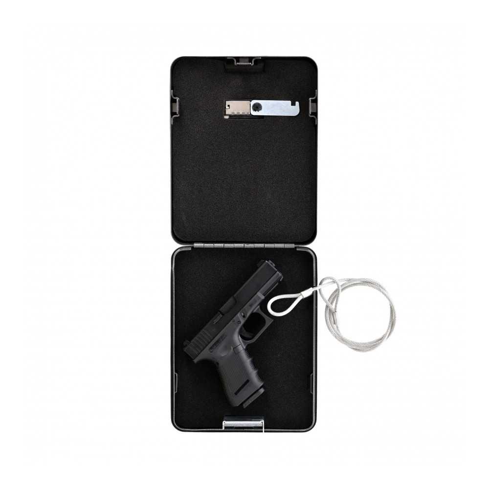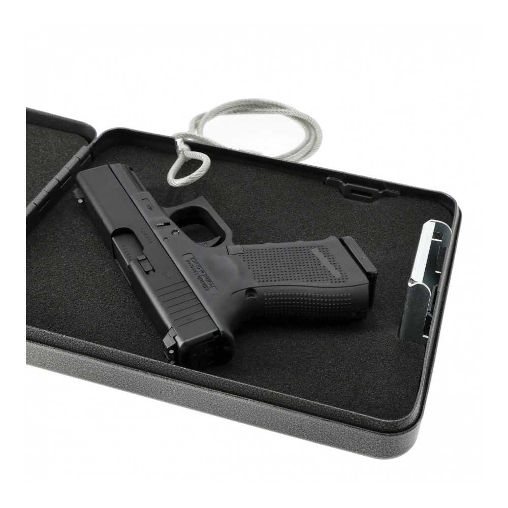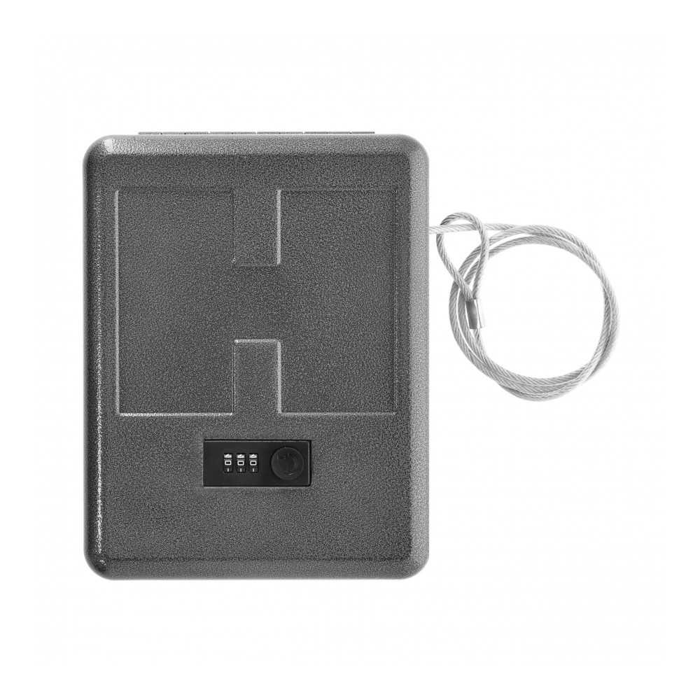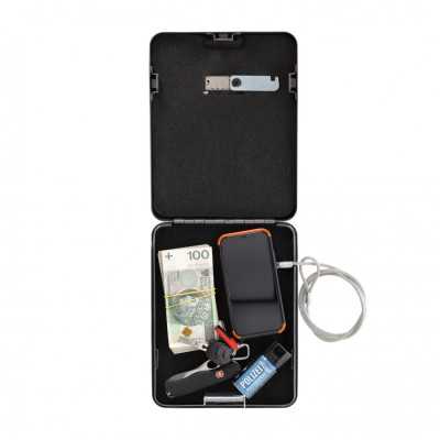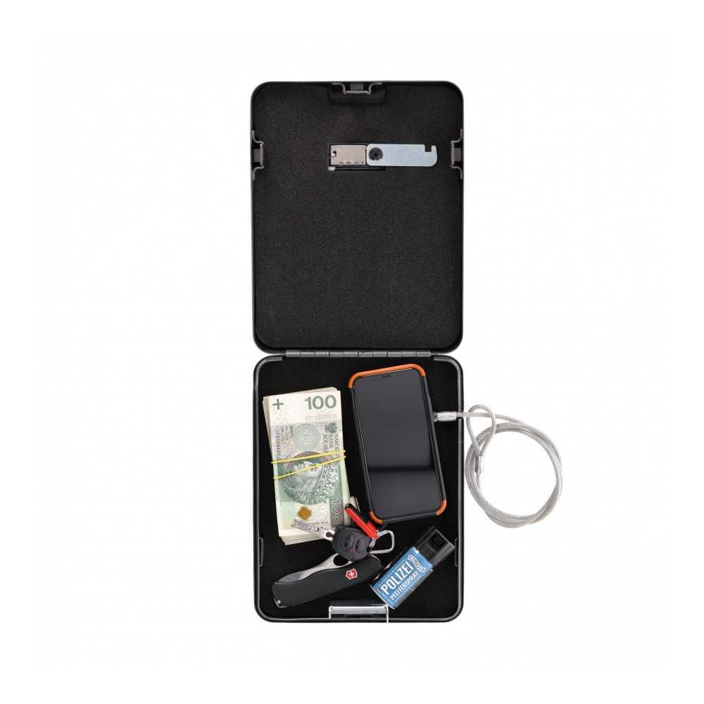 K dalším významným bezpečnostním prvkům patří ocelová lanka o délce přibližně 90 cm, což umožňuje sejf připevnit k pevným prvkům a zabraňuje tak jeho odcizení. Rozměry boxu jsou na vnější straně 24,5 x 16,5 x 5 cm a vnitřní rozměry činí 21,5 x 15,5 x 4,5 cm, což poskytuje dostatek prostoru pro uložení různých cenných předmětů.